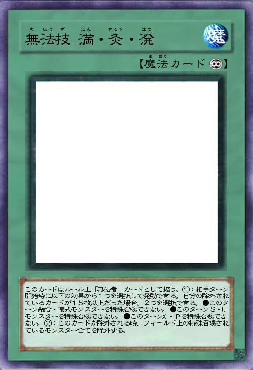 | このカードはルール上「無法者」カードとして扱う。①:相手ターン開始時に以下の効果から1つを選択して発動できる。自分の除外されているカードが15枚以上だった場合、2つを選択できる。●このターン融合・儀式モンスターを特殊召喚できない。●このターンS・Lモンスターを特殊召喚できない。●このターンX・Pを特殊召喚できない。②:このカードが除外される時、フィールド上の特殊召喚されているモンスター全てを除外する。 | |||