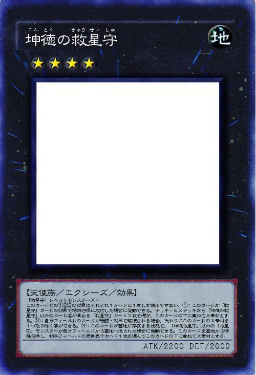 | 「救星守」レベル4モンスター×4 このカード名の①②③の効果はそれぞれ1ターンに1度しか使用できない。①:このカードが「救星守」カードの効果で特殊召喚に成功した場合に発動できる。デッキ・EXデッキから「坤徳の救星守」以外のカード名が異なる「救星守」カード2枚を選び、このカードの下に重ねてX素材とする。②:自分フィールドのカードが戦闘・効果で破壊される場合、代わりにこのカードのX素材を1つ取り除く事ができる。③:このカードが墓地に存在する状態で、「坤徳救星守」以外の「救星守」モンスターが自分フィールドから墓地へ送られた場合に発動できる。このカードを墓地から特殊召喚し、相手フィールドの表側表示カード1枚を選んでこのカードの下に重ねてX素材とする。 | |||