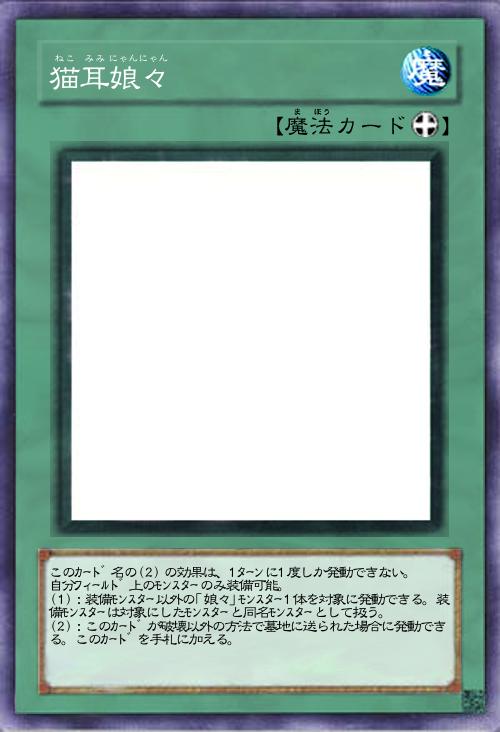 | このカード名の(2)の効果は、1ターンに1度しか発動できない。 自分フィールド上のモンスターのみ装備可能。 (1):装備モンスター以外の「娘々」モンスター1体を対象に発動できる。装備モンスターは対象にしたモンスターと同名モンスターとして扱う。 (2):このカードが破壊以外の方法で墓地に送られた場合に発動できる。このカードを手札に加える。 | |||