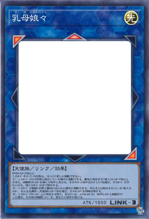 | 同名モンスター2体以上 このカード名の(1)の効果は、1ターンに1度しか発動できない。 (1):このカードがリンク召喚に成功している場合に発動できる。墓地に存在する「娘々」モンスター1体以上を含む、4種類のモンスターを選んで相手に見せる。その中から相手はランダムに1枚選び、そのカードを手札に加え、残りのカードは全て除外する。 (2):このカードが戦闘・効果で墓地に送られた場合に発動できる。手札または除外されている「娘々」モンスター、または光属性・天使族モンスター1体を選び、そのモンスターを特殊召喚する。 (3):このカードがフィールド上に存在する限り、自分フィールド上のモンスターが、相手モンスターと戦闘を行った場合、その倍の戦闘ダメージを、変わりに相手が受ける。 | |||