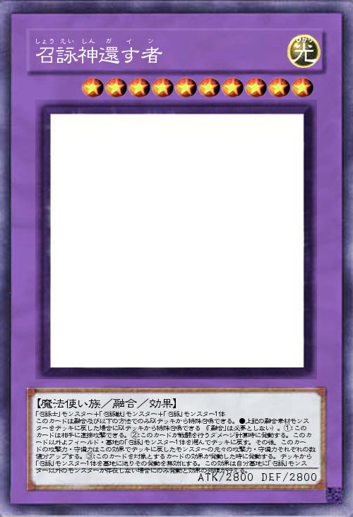 | 「召詠士」モンスター+「召詠獣」モンスター+「召詠」モンスター1体 このカードは融合及び以下の方法でのみEXデッキから特殊召喚できる。●上記の融合素材モンスターをデッキに戻した場合にEXデッキから特殊召喚できる(「融合」は必要としない)。①:このカードは相手に直接攻撃できる。②:このカードが戦闘を行うダメージ計算時に発動する。このカード以外よフィールド・墓地の「召詠」モンスター1体を選んでデッキに戻す。その後、このカードの攻撃力・守備力はこの効果でデッキに戻したモンスターの元々の攻撃力・守備力それぞれの数値分アップする。③:このカードを対象とするカードの効果が発動した時に発動する。デッキから「召詠」モンスター1体を墓地に送りその発動を無効化する。この効果は自分墓地に「召詠」モンスター以外のモンスターが存在しない場合にのみ発動と効果の処理が行える。 | |||