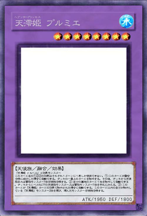 | 「天澪姫 イエール」+効果モンスター このカード名の①②③の効果はそれぞれ1ターンに1度しか使用できない。①:このカードが融合召喚に成功した場合に発動できる。デッキの一番上のカードを除外する。その後、デッキから天使族または雷族モンスター1体を特殊召喚する。②:自分の墓地のカード1枚を除外して発動できる。デッキからレベル4以下の天使族モンスター又は雷族モンスター1体を手札に加える。③:このカードが「天澪姫」カードの効果で除外された場合に発動できる。このカード以外の自分が除外している「天澪姫」モンスター2体を選び、選んだモンスターを特殊召喚する。 | |||