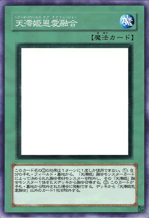 | このカード名の②の効果は1ターンに1度しか使用できない。①:自分の手札・フィールド・墓地から、「天澪姫」融合モンスターカードによって決められた融合素材モンスターを除外し、その「天澪姫」融合モンスター1体をEXデッキから融合召喚する。②:このカードが手札・墓地から除外された場合に発動できる。デッキから「天澪姫恩愛融合」以外のカード1枚を除外する。 | |||