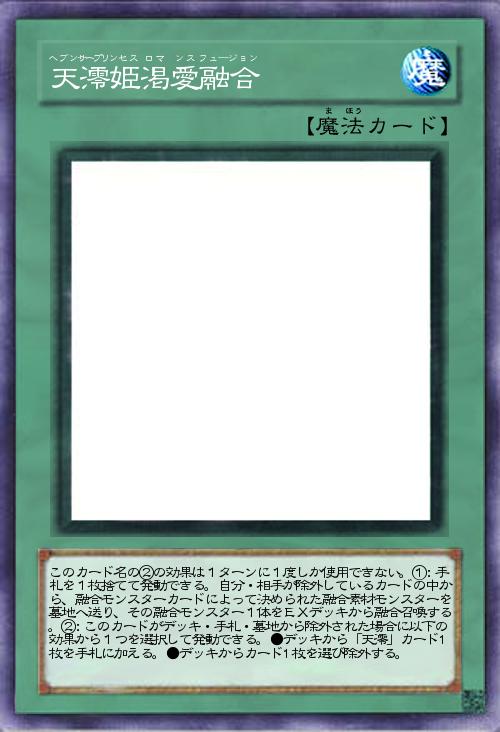 | このカード名の②の効果は1ターンに1度しか使用できない。①:手札を1枚捨てて発動できる。自分・相手が除外しているカードの中から、融合モンスターカードによって決められた融合素材モンスターを墓地へ送り、その融合モンスター1体をEXデッキから融合召喚する。②:このカードがデッキ・手札・墓地から除外された場合に以下の効果から1つを選択して発動できる。●デッキから「天澪」カード1枚を手札に加える。●デッキからカード1枚を選び除外する。 | |||