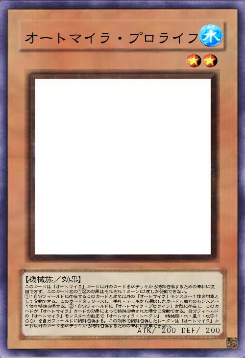 | このカードは「オートマイラ」カード以外のカードをEXデッキから特殊召喚するための素材に使用できず、このカード名の①②の効果はそれぞれ1ターンに1度しか発動できない。 ①:自分フィールドに存在するこのカードと同名以外の「オートマイラ」モンスター1体を対象として発動できる。このカードをリリースし、手札・デッキから選択したカードと同名のモンスター1体を特殊召喚する。②:自分フィールドに「オートマイラ・プロライフ」が既に存在し、このカードが「オートマイラ」カードの効果によって特殊召喚された場合に発動できる。自分フィールドの「オートマイラ」モンスターの数まで「オートマイラ・トークン」(機械族・水・星1・攻守100)を自分フィールドに特殊召喚する。この効果で特殊召喚したトークンは「オートマイラ」カード以外のカードをEXデッキから特殊召喚するための素材に使用できない。 | |||