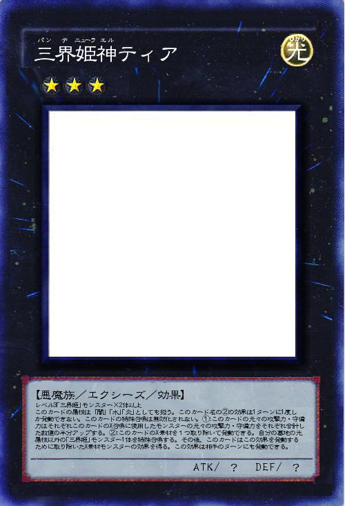 | レベル3「三界姫」モンスター×2体以上 このカードの属性は「闇」「水」「炎」としても扱う。このカード名の②の効果は1ターンに1度しか発動できない。このカードの特殊召喚は無効化されない。①:このカードの元々の攻撃力・守備力はそれぞれこのカードのX召喚に使用したモンスターの元々の攻撃力・守備力をそれぞれ合計した数値の半分アップする。②:このカードのX素材を1つ取り除いて発動できる。自分の墓地の光属性以外の「三界姫」モンスター1体を特殊召喚する。その後、このカードはこの効果を発動するために取り除いたX素材モンスターの効果を得る。この効果は相手のターンにも発動できる。 | |||