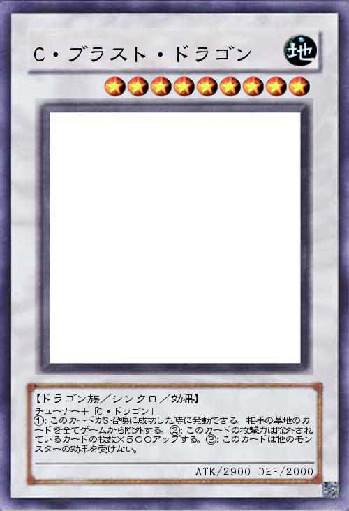 | チューナー+「C・ドラゴン」 ①:このカードがS召喚に成功した時に発動できる。相手の墓地のカードを全てゲームから除外する。②:このカードの攻撃力は除外されているカードの枚数×500アップする。③:このカードは他のモンスターの効果を受けない。 | |||