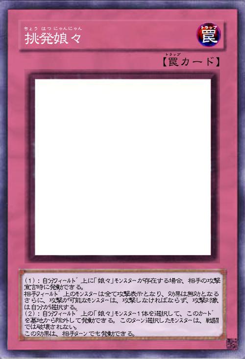 けやぐ「俺はこの瞬間!罠カード、挑発娘々を発動!このカードは、自分フィールド上に娘々モンスターが存在する時、娘々はお前のモンスター達全員を挑発し、効果を無効にし、強制的にバトルを行わせる!!」