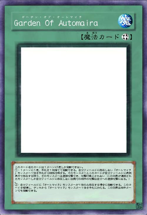 | このカード名のカードは1ターンに1度しか発動できない。 ①:1ターンに1度、手札を1枚捨てて発動できる。自分フィールドに存在しない「オートマイラ」モンスター1体を手札から特殊召喚する。そのモンスターとこのカードが自分フィールドに表側表示で存在する限り、そのモンスターは直接攻撃でき、攻撃対象にされない(この効果が適用されたモンスターしか自分フィールドに存在しない状態での相手の攻撃は自分への直接攻撃になる。)。 ②:自分フィールドに「オートマイラ」モンスターが1体のみ存在する場合に発動できる。このカードを破壊し、デッキから「オートマイラ」モンスター1体を手札に加える。この効果は相手ターンでも発動できる。 | |||