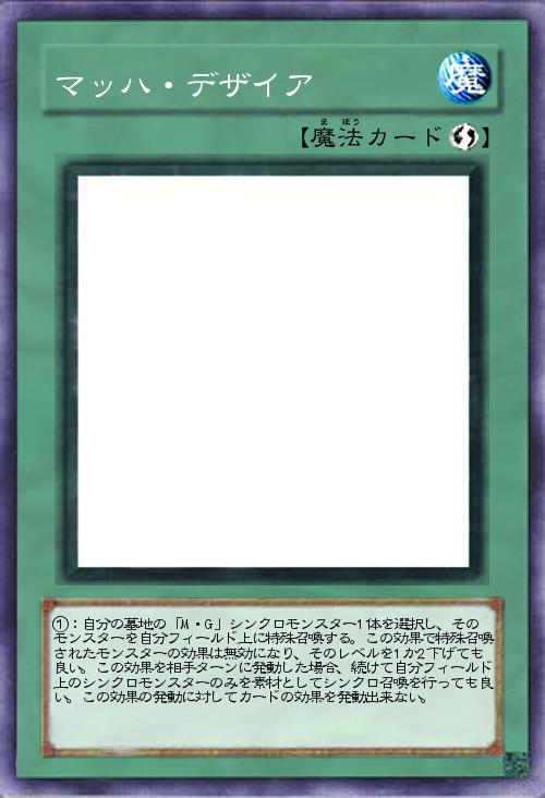 | ①:自分の墓地の「M・G」シンクロモンスター1体を選択し、そのモンスターを自分フィールド上に特殊召喚する。この効果で特殊召喚されたモンスターの効果は無効になり、そのレベルを1か2下げても良い。この効果を相手ターンに発動した場合、続けて自分フィールド上のシンクロモンスターのみを素材としてシンクロ召喚を行っても良い。この効果の発動に対してカードの効果を発動出来ない。 | |||