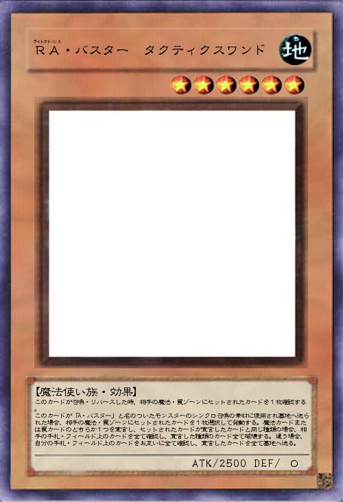 このカードが召喚・リバースした時、相手の魔法・罠ゾーンにセットされたカードを1枚確認する。 このカードが「A・バスター」と名のついたモンスターのシンクロ召喚の素材に使用され墓地へ送られた場合、相手の魔法・罠ゾーンにセットされたカードを1枚選択して発動する。魔法カードまたは罠カードのどちらか1つを宣言し、セットされたカードが宣言したカードと同じ種類の場合、相手の手札・フィールド上のカードを全て確認し、宣言した種類のカード全て破壊する。違う場合、自分の手札・フィールド上のカードをお互いに全て確認し、宣言したカードを全て墓地へ送る。 |