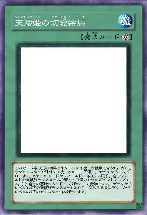 | このカード名の③の効果は1ターンに1度しか使用できない。①:自分がモンスターを除外する度、200LP回復し、デッキから1枚ドローする。②:このカードがフィールドに存在する限り、自分フィールドの天使族モンスターの攻撃力・守備力を800ポイントアップする。③:自分の墓地のカード1枚を除外して発動できる。デッキからレベル3以下の天使族モンスター1体を手札に加える又はデッキからレベル4以下のモンスター1体を除外する。 | |||