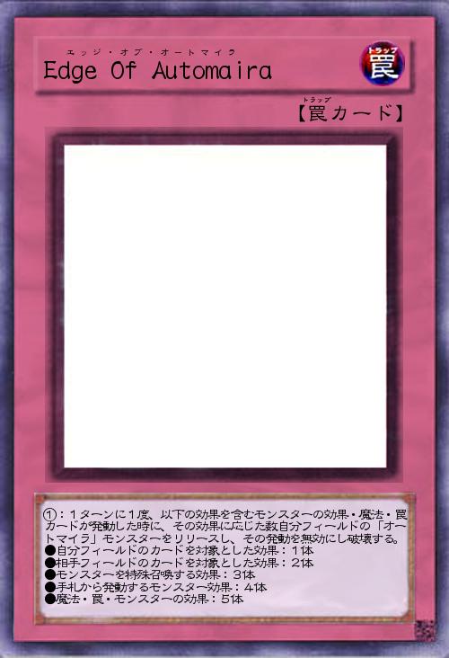 | ①:1ターンに1度、以下の効果を含むモンスターの効果・魔法・罠カードが発動した時に、その効果に応じた数自分フィールドの「オートマイラ」モンスターをリリースし、その発動を無効にし破壊する。 ●自分フィールドのカードを対象とした効果:1体 ●相手フィールドのカードを対象とした効果:2体 ●モンスターを特殊召喚する効果:3体 ●手札から発動するモンスター効果:4体 ●魔法・罠・モンスターの効果:5体 | |||