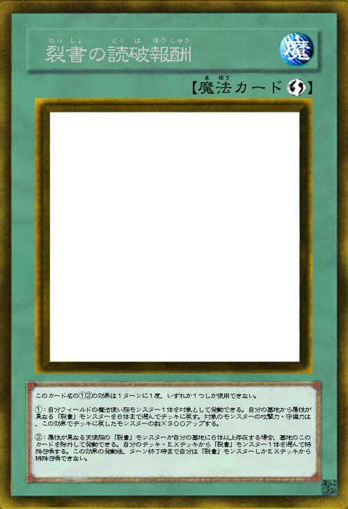 | このカード名の①②の効果は1ターンに1度、いずれか1つしか使用できない。 ①:自分フィールドの魔法使い族モンスター1体を対象として発動できる。自分の墓地から属性が異なる「裂書」モンスターを6体まで選んでデッキに戻す。対象のモンスターの攻撃力・守備力は、この効果でデッキに戻したモンスターの数×300アップする。 ②:属性が異なる天使族の「裂書」モンスターが自分の墓地に6体以上存在する場合、墓地のこのカードを除外して発動できる。自分のデッキ・EXデッキから「裂書」モンスター1体を選んで特殊召喚する。この効果の発動後、ターン終了時まで自分は「裂書」モンスターしかEXデッキから特殊召喚できない。 | |||