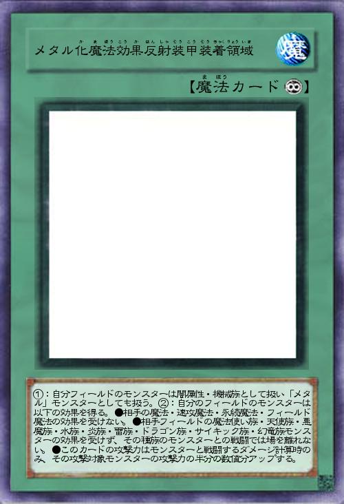 | ①:自分フィールドのモンスターは闇属性・機械族として扱い「メタル」モンスターとしても扱う。②:自分のフィールドのモンスターは以下の効果を得る。●相手の魔法・速攻魔法・永続魔法・フィールド魔法の効果を受けない。●相手フィールドの魔法使い族・天使族・悪魔族・水族・炎族・雷族・ドラゴン族・サイキック族・幻竜族モンスターの効果を受けず、その種族のモンスターとの戦闘では場を離れない。●このカードの攻撃力はモンスターと戦闘するダメージ計算時のみ、その攻撃対象モンスターの攻撃力の半分の数値分アップする。 | |||