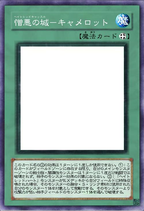 | このカード名の②の効果は1ターンに1度しか使用できない。①:このカードがフィールドゾーンに存在する限り、自分のメインモンスターゾーンの戦士族・闇属性モンスターは1ターンに1度だけ戦闘では破壊されず、相手のモンスター効果の対象にならない。②:「ヘイトレッドハート」モンスターがEXデッキから自分フィールドに特殊召喚された場合、そのモンスターの融合・S・リンク素材に使用された自分のモンスター1体を対象として発動できる。そのモンスターより攻撃力が低い相手フィールドのモンスター1体を選んで破壊する。 | |||