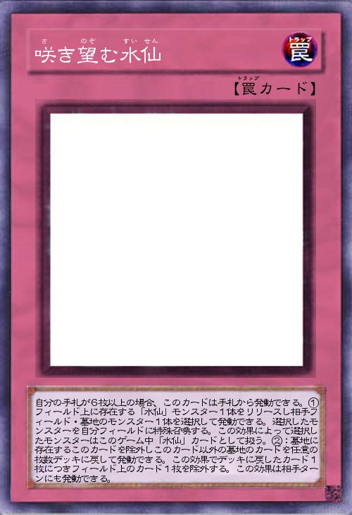 | 自分の手札が6枚以上の場合、このカードは手札から発動できる。①フィールド上に存在する「水仙」モンスター1体をリリースし相手フィールド・墓地のモンスター1体を選択して発動できる。選択したモンスターを自分フィールドに特殊召喚する。この効果によって選択したモンスターはこのゲーム中「水仙」カードとして扱う。②:墓地に存在するこのカードを除外しこのカード以外の墓地のカードを任意の枚数デッキに戻して発動できる。この効果でデッキに戻したカード1枚につきフィールド上のカード1枚を除外する。この効果は相手ターンにも発動できる。 | |||