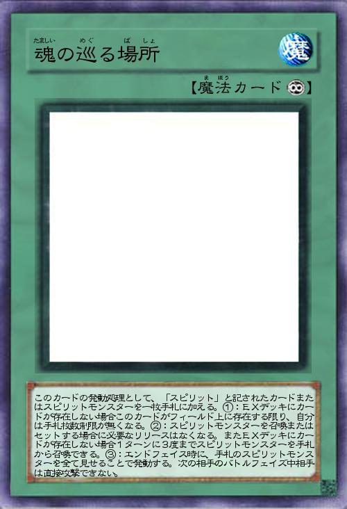| このカードの発動処理として、「スピリット」と記されたカードまたはスピリットモンスターを一枚手札に加える。①:EXデッキにカードが存在しない場合このカードがフィールド上に存在する限り、自分は手札枚数制限が無くなる。②:スピリットモンスターを召喚またはセットする場合に必要なリリースはなくなる。またEXデッキにカードが存在しない場合1ターンに3度までスピリットモンスターを手札から召喚できる。③:エンドフェイス時に、手札のスピリットモンスターを全て見せることで発動する。次の相手のバトルフェイズ中相手は直接攻撃できない。 | |||