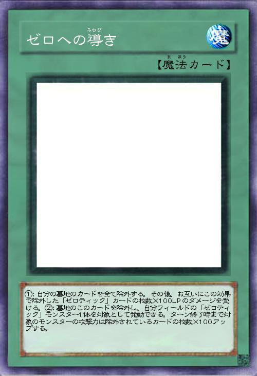| ①:自分の墓地のカードを全て除外する。その後、お互いにこの効果で除外した「ゼロティック」カードの枚数×100LPのダメージを受ける。②:墓地のこのカードを除外し、自分フィールドの「ゼロティック」モンスター1体を対象として発動できる。ターン終了時まで対象のモンスターの攻撃力は除外されているカードの枚数×100アップする。 | |||