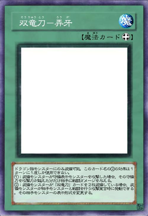 | ドラゴン族モンスターにのみ装備可能。このカード名の②の効果は1ターンに1度しか使用できない。 ①:装備モンスターが守備表示モンスターを攻撃した場合、その守備力を攻撃力が超えた分だけ相手に戦闘ダメージを与える。 ②:装備モンスターが「双竜刀」カードを2枚装備している場合、装備モンスターが相手モンスターと戦闘を行う攻撃宣言時に発動できる。その相手モンスターの表示形式を変更する。 | |||