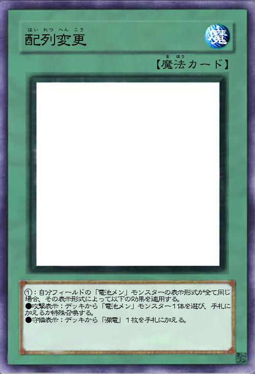 | ①:自分フィールドの「電池メン」モンスターの表示形式が全て同じ場合、その表示形式によって以下の効果を適用する。 ●攻撃表示:デッキから「電池メン」モンスター1体を選び、手札に加えるか特殊召喚する。 ●守備表示:デッキから「漏電」1枚を手札に加える。 | |||