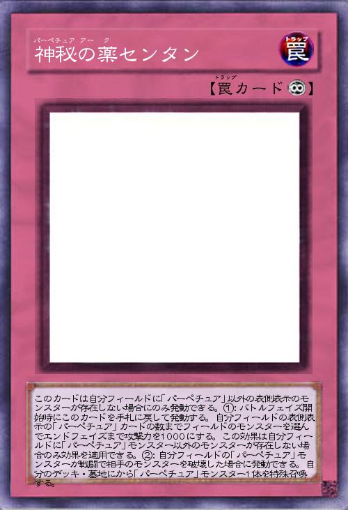 | このカードは自分フィールドに「パーペチュア」以外の表側表示のモンスターが存在しない場合にのみ発動できる。①:バトルフェイズ開始時にこのカードを手札に戻して発動する。自分フィールドの表側表示の「パーペチュア」カードの数までフィールドのモンスターを選んでエンドフェイズまで攻撃力を1000にする。この効果は自分フィールドに「パーペチュア」モンスター以外のモンスターが存在しない場合のみ効果を適用できる。②:自分フィールドの「パーペチュア」モンスターが戦闘で相手のモンスターを破壊した場合に発動できる。自分のデッキ・墓地にから「パーペチュア」モンスター1体を特殊召喚する。 | |||