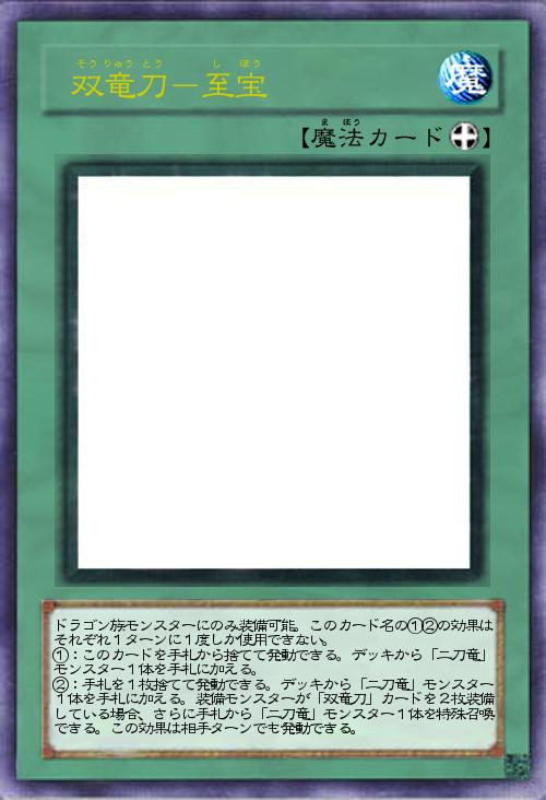 | ドラゴン族モンスターにのみ装備可能。このカード名の①②の効果はそれぞれ1ターンに1度しか使用できない。 ①:このカードを手札から捨てて発動できる。デッキから「二刀竜」モンスター1体を手札に加える。 ②:手札を1枚捨てて発動できる。デッキから「二刀竜」モンスター1体を手札に加える。装備モンスターが「双竜刀」カードを2枚装備している場合、さらに手札から「二刀竜」モンスター1体を特殊召喚できる。この効果は相手ターンでも発動できる。 | |||