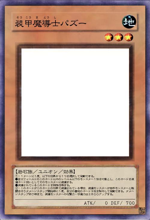| ①:1ターンに1度、以下の効果から1つを選択して発動できる。 ●自分フィールドのこのカード以外のレベル4以下のモンスター1体を対象とし、このカードを装備カード扱いとしてそのモンスターに装備する。 ●装備されているこのカードを特殊召喚する。 ②:このカードがこのカードの効果で装備されている場合、装備モンスターが相手モンスターと戦闘を行うダメージステップ開始時に1度、自分の墓地のカード3枚を除外して発動できる。ダメージステップ終了時まで、装備モンスターの攻撃力・守備力は2500アップする。 | |||