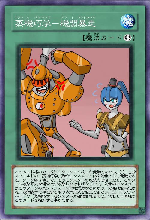 | このカード名のカードは1ターンに1枚しか発動できない。①:自分フィールドの「蒸機巧学」融合モンスター1体を対象として発動できる。ターン終了時まで、そのモンスターの攻撃力は倍になり、このターン攻撃可能な場合必ず攻撃しなければならない。対象のモンスターはこのターンのエンドフェイズに攻撃力が0になり、効果は無効化され、表側表示で存在する限り表示形式を変更できない。②:自分フィールドの「蒸機巧学」モンスターが破壊される場合、代わりに墓地のこのカードを除外する事ができる。 | |||