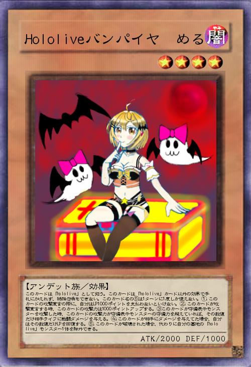 | このカードは「hololive」として扱う。このカードは「hololive」カード以外の効果で手札に加えれず、特殊召喚もできない。このカード名の⑤は1ターンに1度しか使えない。①.このカードの攻撃宣言の際に、自分はLP1000ポイントを支払わないといけない。②.このカードが攻撃宣言する時、このカードの攻撃力は1000ポイントアップする。③このカードが守備表示モンスターを攻撃した時、このカードの攻撃力が守備表示モンスターの守備力を超えていれば、その数値だけ相手ライフに戦闘ダメージを与える。④.このカードが相手にダメージを与えてた場合、自分はその数値だけLPを回復する。⑤.このカードが破壊された場合、代わりに自分の墓地の「hololive」モンスター1体を除外できる。 | |||