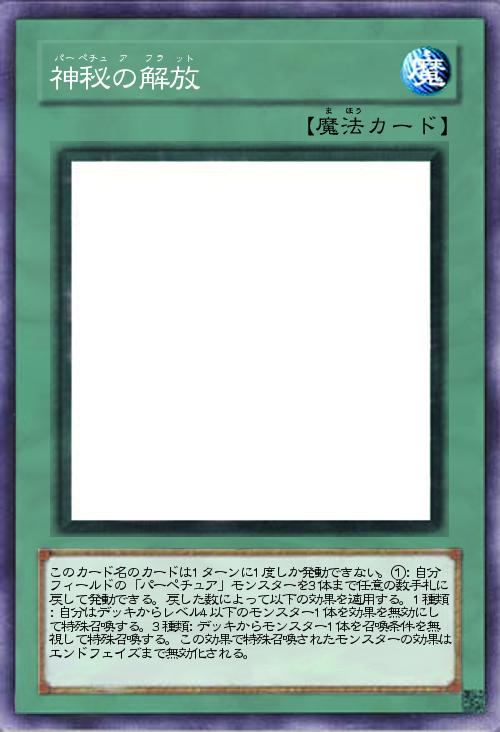 | このカード名のカードは1ターンに1度しか発動できない。①:自分フィールドの「パーペチュア」モンスターを3体まで任意の数手札に戻して発動できる。戻した数によって以下の効果を適用する。1種類:自分はデッキからレベル4以下のモンスター1体を効果を無効にして特殊召喚する。3種類:デッキからモンスター1体を召喚条件を無視して特殊召喚する。この効果で特殊召喚されたモンスターの効果はエンドフェイズまで無効化される。 | |||