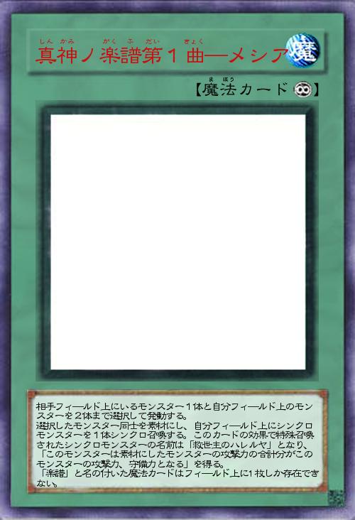 相手フィ―ルド上にいるモンスター1体と自分フィ―ルド上のモンスターを2体まで選択して発動する。 選択したモンスター同士を素材にし、自分フィ―ルド上にシンクロモンスターを1体シンクロ召喚する。このカードの効果で特殊召喚されたシンクロモンスターの名前は「救世主のハレルヤ」となり、「このモンスターは素材にしたモンスターの攻撃力の合計分がこのモンスターの攻撃力、守備力となる」を得る。 「楽譜」と名の付いた魔法カードはフィ―ルド上に1枚しか存在できない。 |
