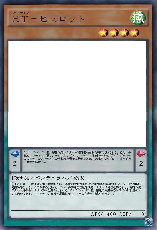 | ①:1ターンに1度、風属性モンスターが特殊召喚された時に発動できる。自分は手札を1枚デッキに戻し、デッキから「ET」カード1体を除外する。②:Pゾーンのこのカードがフィールドから離れた場合に発動できる。除外された「ET」カードを1枚手札に加える。 | |||