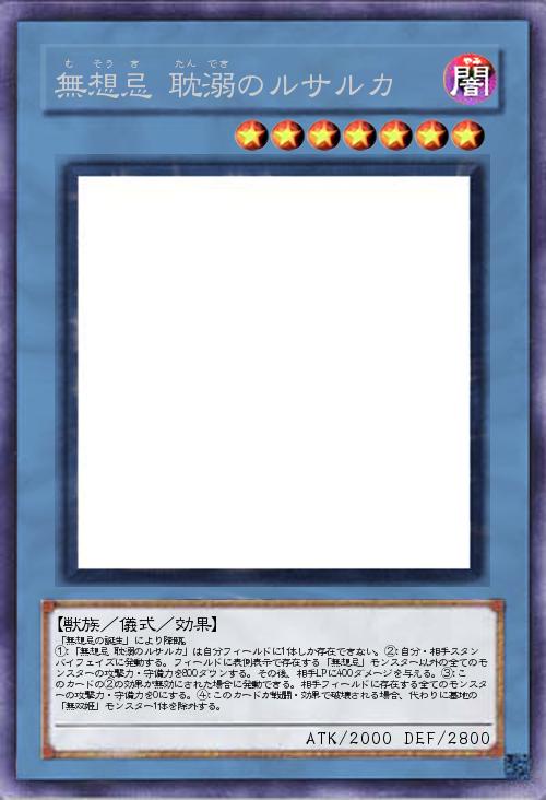 | 「無想忌の誕生」により降臨。 ①:「無想忌 耽溺のルサルカ」は自分フィールドに1体しか存在できない。②:自分・相手スタンバイフェイズに発動する。フィールドに表側表示で存在する「無想忌」モンスター以外の全てのモンスターの攻撃力・守備力を800ダウンする。その後、相手LPに400ダメージを与える。③:このカードの②の効果が無効にされた場合に発動できる。相手フィールドに存在する全てのモンスターの攻撃力・守備力を0にする。④:このカードが戦闘・効果で破壊される場合、代わりに墓地の「無双姫」モンスター1体を除外する。 | |||