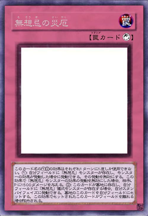 | このカード名の①②の効果はそれぞれ1ターンに1度しか使用できない。①:自分フィールドに「無想忌」モンスターが存在し、モンスターの効果が発動した場合に発動できる。その発動を無効にする。この効果で「無想忌」モンスターの効果の発動を無効にした場合、相手LPに1500ダメージを与える。②:このカードが墓地に存在し、自分フィールドに「無想忌」儀式モンスターが存在する場合、自分スタンバイフェイズに発動できる。墓地のこのカードを自分フィールドにセットする。この効果でセットされたこのカードがフィールドを離れる場合除外される。 | |||