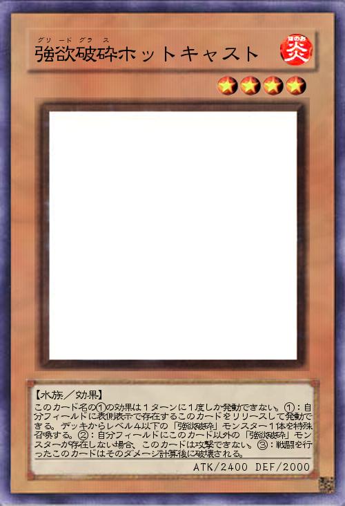 | このカード名の①の効果は1ターンに1度しか発動できない。①:自分フィールドに表側表示で存在するこのカードをリリースして発動できる。デッキからレベル4以下の「強欲破砕」モンスター1体を特殊召喚する。②:自分フィールドにこのカード以外の「強欲破砕」モンスターが存在しない場合、このカードは攻撃できない。③:戦闘を行ったこのカードはそのダメージ計算後に破壊される。 | |||