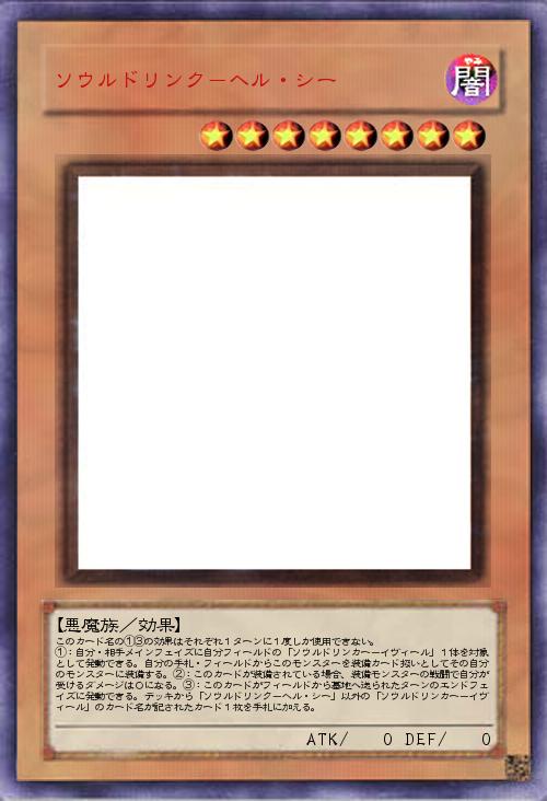 | このカード名の①③の効果はそれぞれ1ターンに1度しか使用できない。 ①:自分・相手メインフェイズに自分フィールドの「ソウルドリンカー-イヴィール」1体を対象として発動できる。自分の手札・フィールドからこのモンスターを装備カード扱いとしてその自分のモンスターに装備する。②:このカードが装備されている場合、装備モンスターの戦闘で自分が受けるダメージは0になる。③:このカードがフィールドから墓地へ送られたターンのエンドフェイズに発動できる。デッキから「ソウルドリンク-ヘル・シー」以外の「ソウルドリンカー-イヴィール」のカード名が記されたカード1枚を手札に加える。 | |||