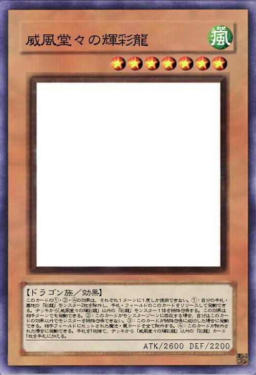 | このカードの①・③・④の効果は、それぞれ1ターンに1度しか使用できない。①:自分の手札・墓地の「彩龍」モンスター2枚を除外し、手札・フィールドのこのカードをリリースして発動できる。デッキから[威風堂々の輝彩龍」以外の「彩龍」モンスター1体を特殊召喚する。この効果は相手ターンでも発動できる。②:このカードがモンスターゾーンに存在する場合、自分はこのカードの効果以外でモンスターを特殊召喚できない。③:このカードが特殊召喚に成功した場合に発動できる。相手フィールドにセットされた魔法・罠カードを全て除外する。④:このカードが除外された場合に発動できる。手札を1枚捨て、デッキから「威風堂々の輝彩龍」以外の「彩龍」カード1枚を手札に加える。 | |||