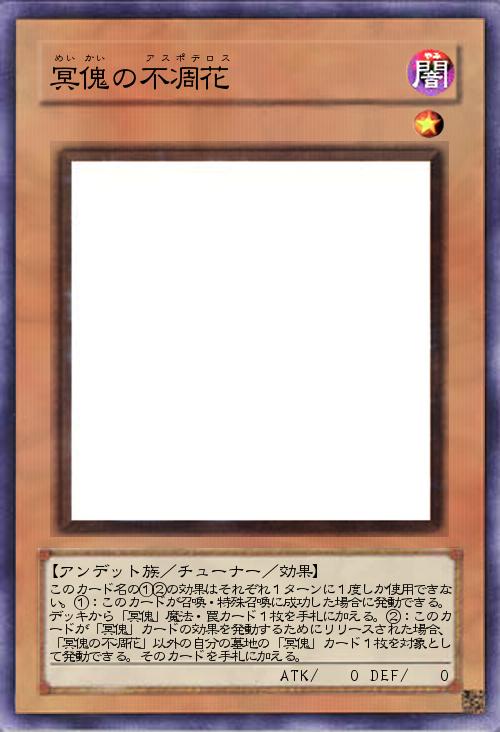 | このカード名の①②の効果はそれぞれ1ターンに1度しか使用できない。①:このカードが召喚・特殊召喚に成功した場合に発動できる。デッキから「冥傀」魔法・罠カード1枚を手札に加える。②:このカードが「冥傀」カードの効果を発動するためにリリースされた場合、「冥傀の不凋花」以外の自分の墓地の「冥傀」カード1枚を対象として発動できる。そのカードを手札に加える。 | |||
