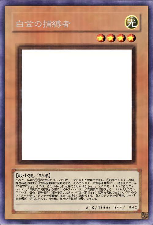 | このカード名の①③の効果は1ターンに1度、いずれかしか使用できない。①相手モンスターの特殊召喚成功時または効果発動時に発動できる。そのモンスターの効果を無効にし、持ち主のデッキの1番下に戻す。その後、自分は手札を1枚捨てなければならない。②このモンスターが自分フィールド上に表側表示で存在する限り、相手フィールド上に表側表示で存在するレベル4以上のモンスターは、召喚・反転召喚・特殊召喚したターンには攻撃できず、効果も発動できない。③このモンスターが手札・デッキから墓地に送られた場合に発動できる。自分のデッキから「黒銀」カード1枚を選び、手札に加える。その後、自分の手札を1枚選んで捨てる。 | |||