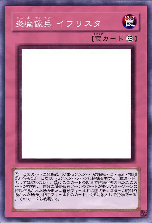 | ①:このカードは発動後、効果モンスター(岩石族・炎・星3・攻1300/守900)となり、モンスターゾーンに特殊召喚する(罠カードとしては扱わない)。②:このカードの効果で特殊召喚されたこのカードが存在し、自分の魔法&罠ゾーンのカードがモンスターゾーンに特殊召喚された場合または自分フィールドに儀式モンスターが特殊召喚された場合、相手フィールドのカード1枚を対象として発動できる。そのカードを破壊する。 | |||