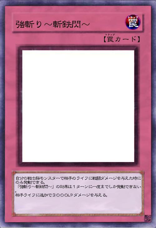 | 自分の戦士族モンスターで相手のライフに戦闘ダメージを与えた時にのみ発動できる。 「強斬り~斬鉄閃~」の効果は1ターンに一度までしか発動できない。 相手ライフに追加で3000LPダメージを与える。 | |||