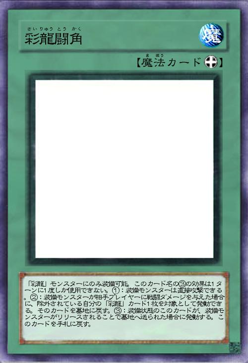 | 「彩龍」モンスターにのみ装備可能。このカード名の③の効果は1ターンに1度しか使用できない。①:装備モンスターは直接攻撃できる。②:装備モンスターが相手プレイヤーに戦闘ダメージを与えた場合に、除外されている自分の「彩龍」カード1枚を対象として発動できる。そのカードを墓地に戻す。③装備状態のこのカードが、装備モンスターがリリースされることで墓地へ送られた場合に発動する。このカードを手札に戻す。 | |||