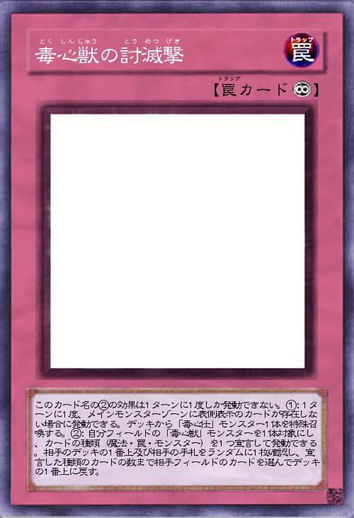 | このカード名の②の効果は1ターンに1度しか発動できない。①:1ターンに1度、メインモンスターゾーンに表側表示のカードが存在しない場合に発動できる。デッキから「毒心仕」モンスター1体を特殊召喚する。②:自分フィールドの「毒心獣」モンスターを1体対象にし、カードの種類(魔法・罠・モンスター)を1つ宣言して発動できる。相手のデッキの1番上及び相手の手札をランダムに1枚確認し、宣言した種類のカードの数まで相手フィールドのカードを選んでデッキの1番上に戻す。 | |||