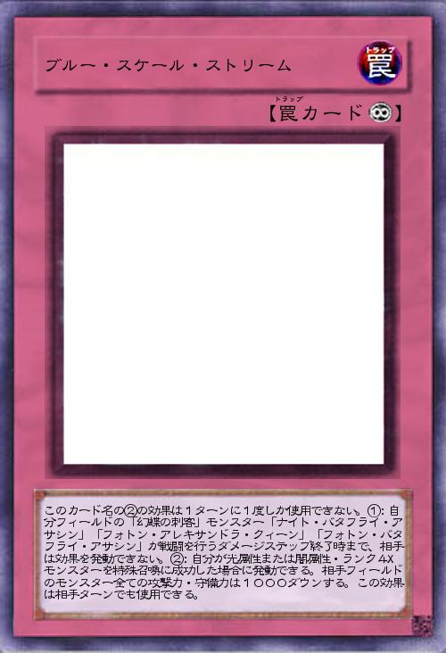 「幻蝶の刺客モルフォの必殺技をカードにしました。アニメでドロワが使っていたモンスターたちに封殺効果を付加する永続罠。光か闇のランク4を特殊召喚した際に相手モンスターの攻守を永続的に弱体化させることもできます。」(2020-11-08 10:51)