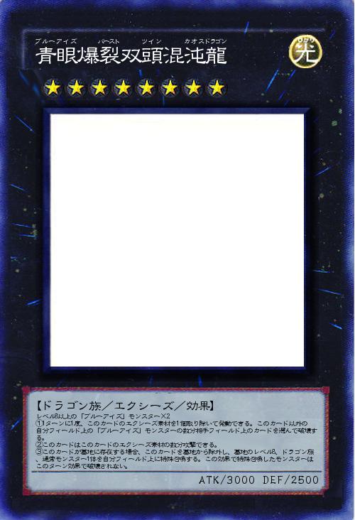 | レベル8以上の「ブルーアイズ」モンスター×2 ①1ターンに1度、このカードのエクシーズ素材を1個取り除いて発動できる。このカード以外の自分フィールド上の「ブルーアイズ」モンスターの数分相手フィールド上のカードを選んで破壊する。 ②このカードはこのカードのエクシーズ素材の数分攻撃できる。 ③このカードが墓地に存在する場合、このカードを墓地から除外し、墓地のレベル8、ドラゴン族、通常モンスター1体を自分フィールド上に特殊召喚する。この効果で特殊召喚したモンスターはこのターン効果で破壊されない。 | |||