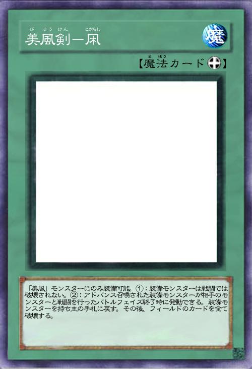 | 「美風」モンスターにのみ装備可能。①:装備モンスターは戦闘では破壊されない。②:アドバンス召喚された装備モンスターが相手のモンスターと戦闘を行ったバトルフェイズ終了時に発動できる。装備モンスターを持ち主の手札に戻す。その後、フィールドのカードを全て破壊する。 | |||