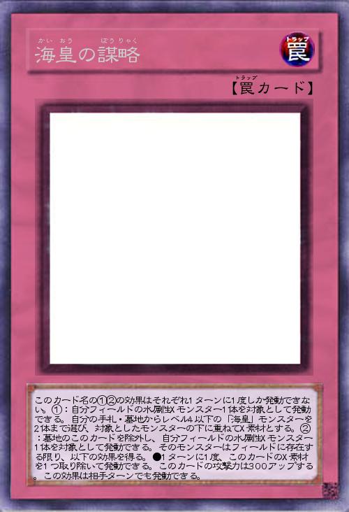 | このカード名の①②の効果はそれぞれ1ターンに1度しか発動できない。①:自分フィールドの水属性Xモンスター1体を対象として発動できる。自分の手札・墓地からレベル4以下の「海皇」モンスターを2体まで選び、対象としたモンスターの下に重ねてX素材とする。②:墓地のこのカードを除外し、自分フィールドの水属性Xモンスター1体を対象として発動できる。そのモンスターはフィールドに存在する限り、以下の効果を得る。●1ターンに1度、このカードのX素材を1つ取り除いて発動できる。このカードの攻撃力は300アップする。この効果は相手ターンでも発動できる。 | |||