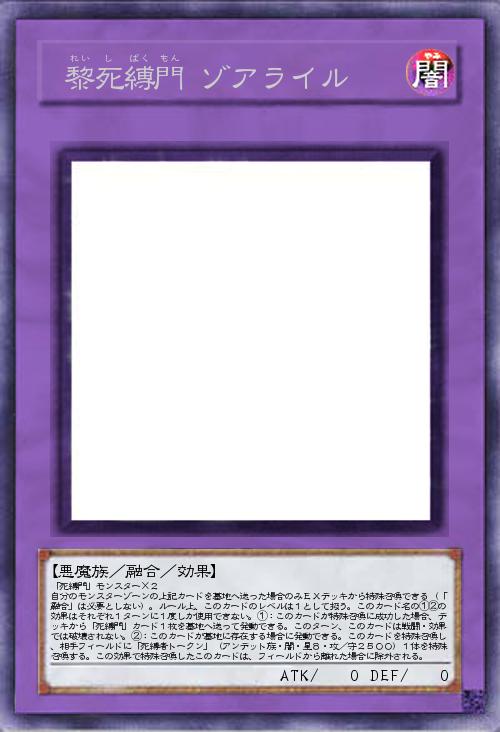 | 「死縛門」モンスター×2 自分のモンスターゾーンの上記カードを墓地へ送った場合のみEXデッキから特殊召喚できる(「融合」は必要としない)。ルール上、このカードのレベルは1として扱う。このカード名の①②の効果はそれぞれ1ターンに1度しか使用できない。①:このカードが特殊召喚に成功した場合、デッキから「死縛門」カード1枚を墓地へ送って発動できる。このターン、このカードは戦闘・効果では破壊されない。②:このカードが墓地に存在する場合に発動できる。このカードを特殊召喚し、相手フィールドに「死縛者トークン」(アンデット族・闇・星8・攻/守2500)1体を特殊召喚する。この効果で特殊召喚したこのカードは、フィールドから離れた場合に除外される。 | |||