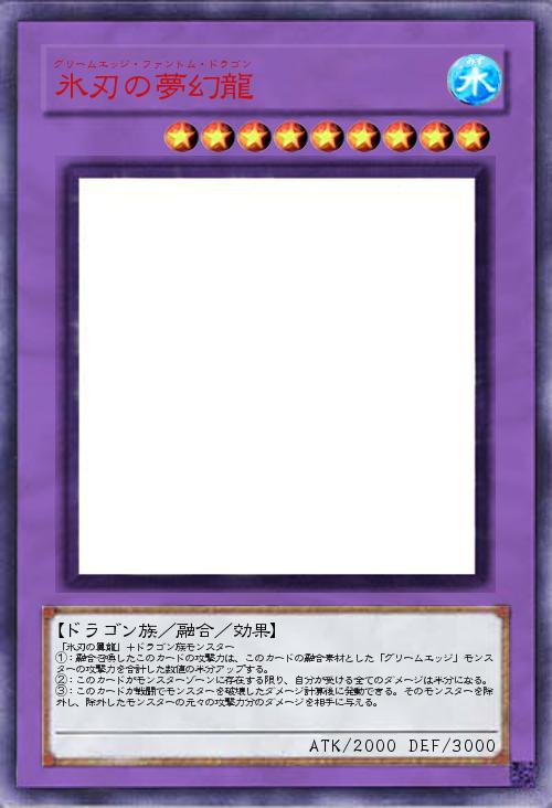 | 「氷刃の翼龍」+ドラゴン族モンスター ①:融合召喚したこのカードの攻撃力は、このカードの融合素材とした「グリームエッジ」モンスターの攻撃力を合計した数値の半分アップする。 ②:このカードがモンスターゾーンに存在する限り、自分が受ける全てのダメージは半分になる。 ③:このカードが戦闘でモンスターを破壊したダメージ計算後に発動できる。そのモンスターを除外し、除外したモンスターの元々の攻撃力分のダメージを相手に与える。 | |||